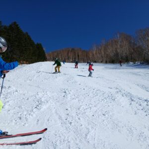 クラブの公式行事は12月の初滑りに始まり、1月、2月、3月と公式行事を実施しています。スキー場は群馬県、長野県が中心です。いずれの行事も技術水準に応じた班別構成で進めています。最終日は全員でのゲレンデ滑りやグループに分かれたりと様々です。