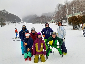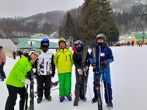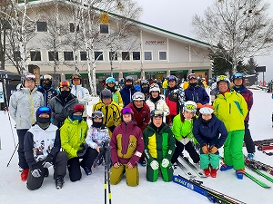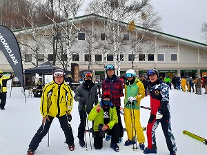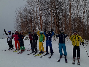 2日目はフリー。 小雨の中、スキーをやめ、帰る組と、せっかく来たのだからとゲレンデに向かう組に分かれました。写真は、西山ゲレンデのトップに集まったメンバー。お試し参加のKさんもいます。