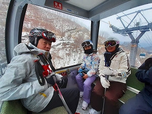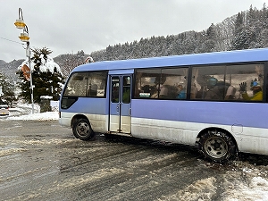 宿のバスで岩鞍スキー場に向います。迎えは初日は午後4時に全員を、2日目は12時と14時に分けて迎えに来てもらいました。